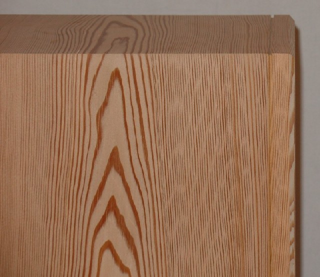 Detail: mit Schattenfuge stumpf aufgesetzte Front, Korpusseiten auf Gehrung mit durchlaufendem Furnierbild Lärche