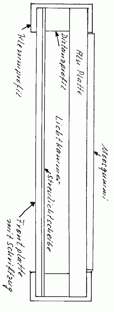 Wenn die Seitenteile in den Sockel geklebt sind, wird nach dem Aushärten des Klebers das Moosgummi mit noch vorhandener Schutzfolie gegen die Seitenwand gehalten und die Befestigungslöcher werden angezeichnet. Dann werden die Löcher mittels Lochpfeife ausgestanzt und aufgeklebt. Hierauf folgt die Befestigungsorgie der 5 Klangkörper. Die quadratischen Distanzprofile (15x15) werden mittels doppelseitigem Klebeband an der Kante der großen Alu Platte aufgeklebt. Dann wird der Beleuchtungsschlauch "eingehangen" hinter den beiden Schraubenköpfen oben in der Aluplatte und unten durch die Aluplatte wieder raus. Die "Streuscheibe" und die Plexischeibe mit dem Schriftzug werden eingelegt/vorgelegt und das Alu C-Profil mit sanfter Gewalt von der Seite her aufgeschoben. Sollte das Profil zu "leicht" sitzen, kann man die Klemmwirkung erhöhen durch Beilage eines dünnen Pappsteifens im Profil selbst oder unter den Plexiplatten, Selbstklebestreifen im Bereich der dicken Aluplatte würden natürlich auch gehen. Zum Schluß wird das Lochblech oben auf die Beleuchtungskammer geklebt um Stauwärme zu vermeiden. Wer sich die Mühe machen möchte, kann ja auch das Klemmprofil als Abschluß oben verarbeiten, nur dann muß man auf Gehrung arbeiten und darf die Löcher für die Entlüftung der Lichtkammer nicht vergessen!