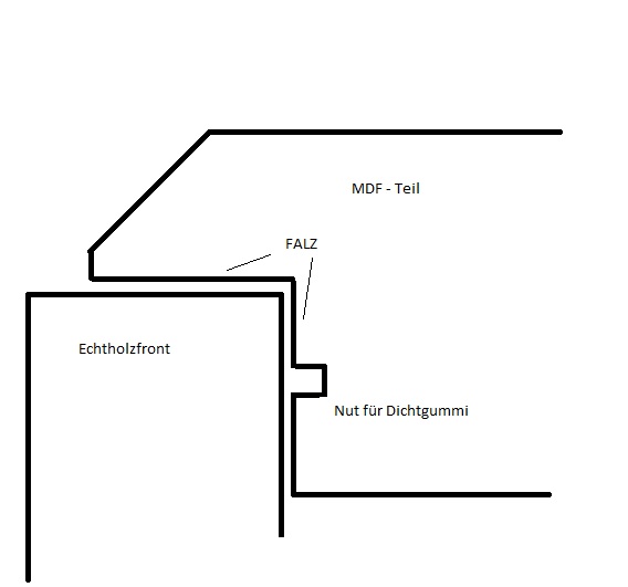 Bei Philipps Skizze kommt dann nur ein Radius statt der Schräge an das MDF Teil und schon hast Du den "weichen" Übergang zur Seite. Das MDF Teil kannst Du natürlich auch exakt bis zur Seitenwand gehen lassen. Die umlaufende Nut, Falz, kaschiert Ungenauigkeiten und unterschiedliches "Arbeiten" zwischen Front und Gehäuse.